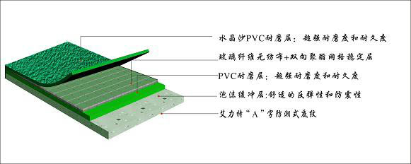 3、1.2mm耐磨層,玻纖無紡布+雙向聚酯網(wǎng)格穩(wěn)定層耐磨結(jié)構(gòu),6年以上使用壽命